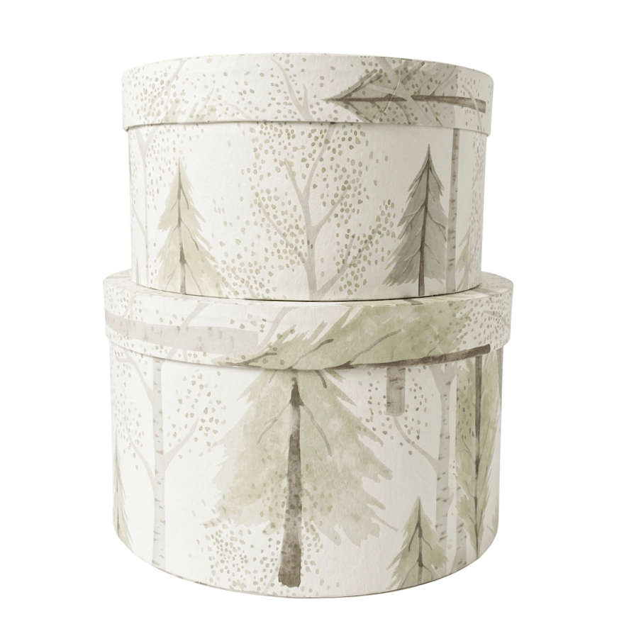 Bring a touch of the serene outdoors into your home with this set of round nesting storage boxes. Adorned with a delicate watercolor forest scene, these boxes feature soft sage evergreens and birch trees against a clean, off-white background. Perfect for organizing craft supplies, accessories, or keepsakes, their cylindrical shape adds a soft, organic feel to any shelf or vanity. Sturdy yet lightweight, they stack beautifully to save space while doubling as charming woodland decor.