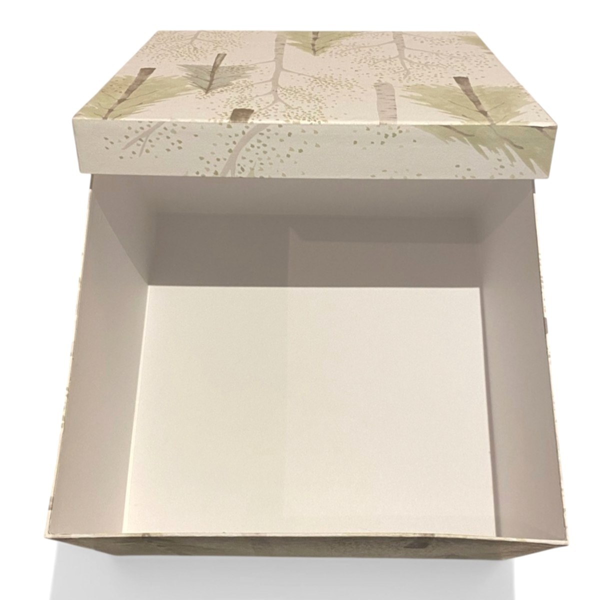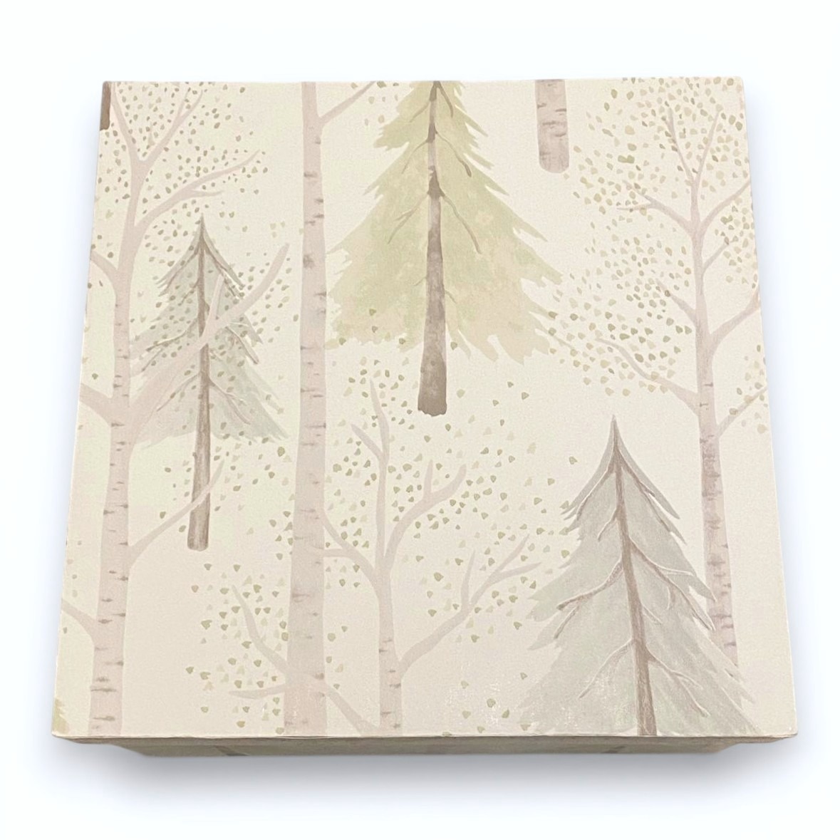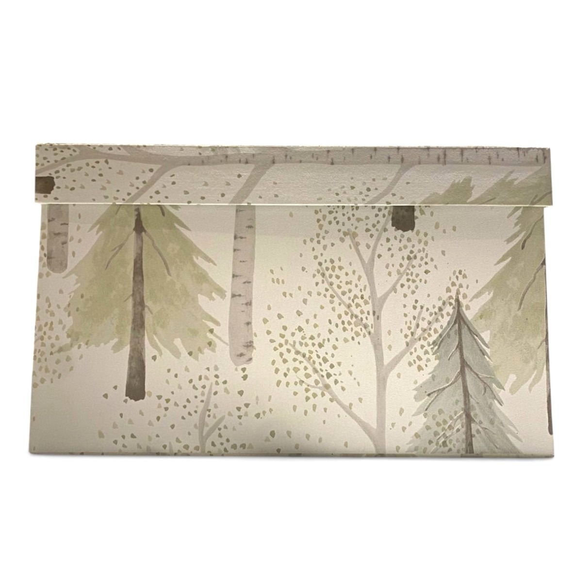 Organize your home with a touch of woodland charm using this set of square nesting storage boxes. Each box is wrapped in a beautiful watercolor illustration of a misty birch forest with soft sage evergreens. The clean, white interior and sturdy construction make them as functional as they are decorative. Perfect for tucking away paperwork, jewelry, or office supplies, these boxes look stunning whether stacked as a centerpiece or styled individually.