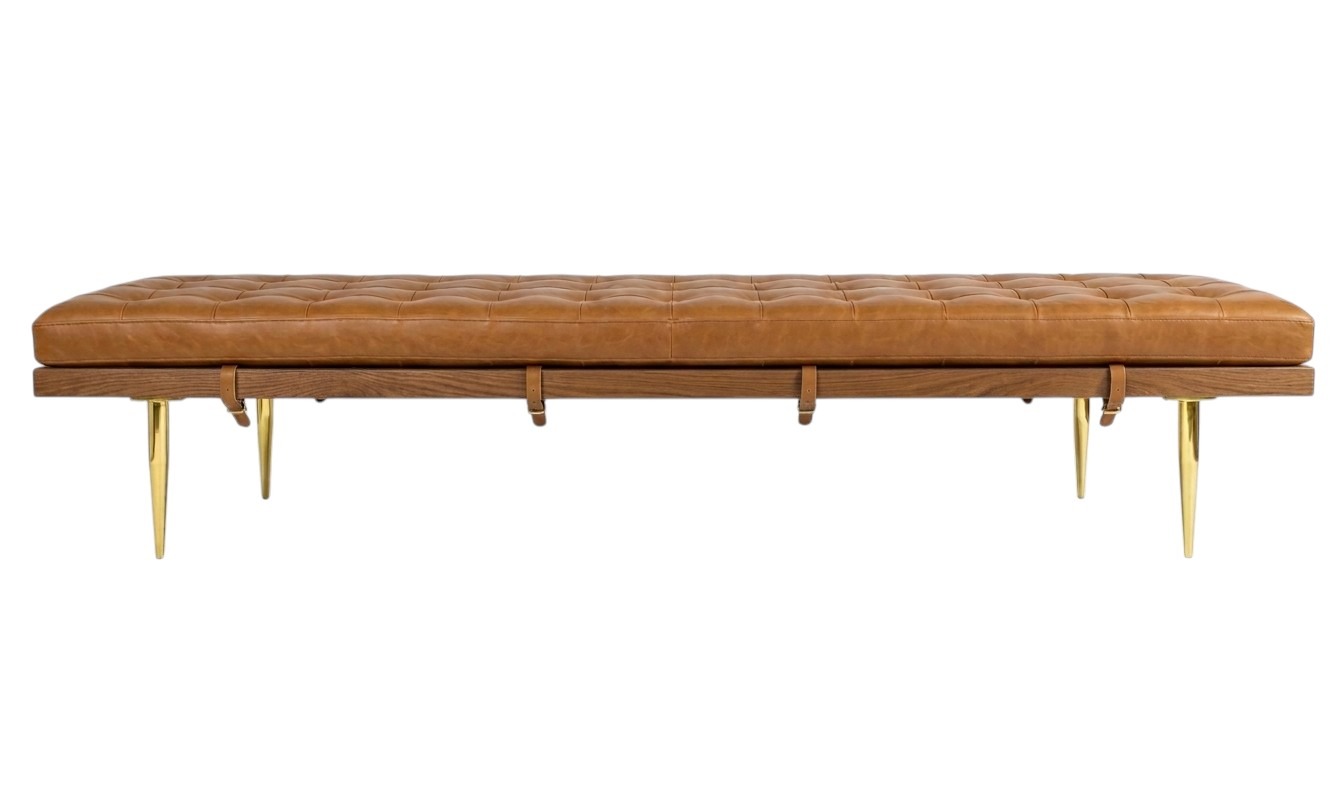 Gallery Sofa Daybed in American walnut frame with foam-padded leather Camel cushion seat and brass spike legs.