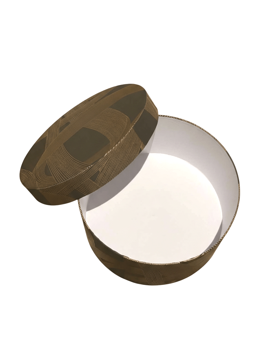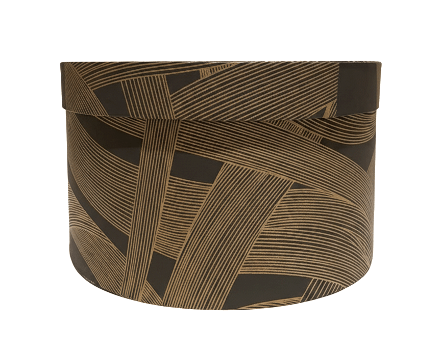 Add a touch of contemporary luxury to your home with this cylindrical designer storage box. It features a deep charcoal base enveloped in an intricate, metallic gold ribbon-swirl motif. This elegant round box is perfect for storing keepsakes or acting as a high-end gift container.