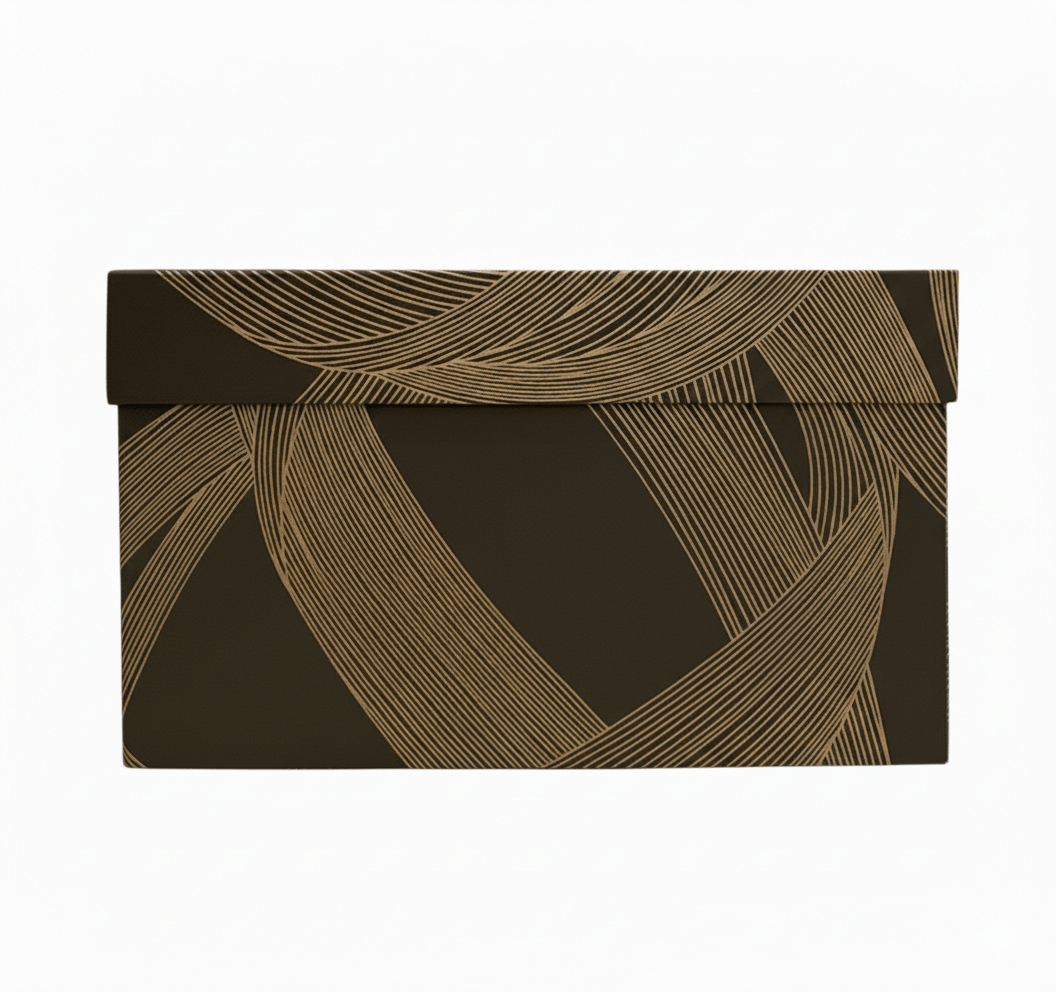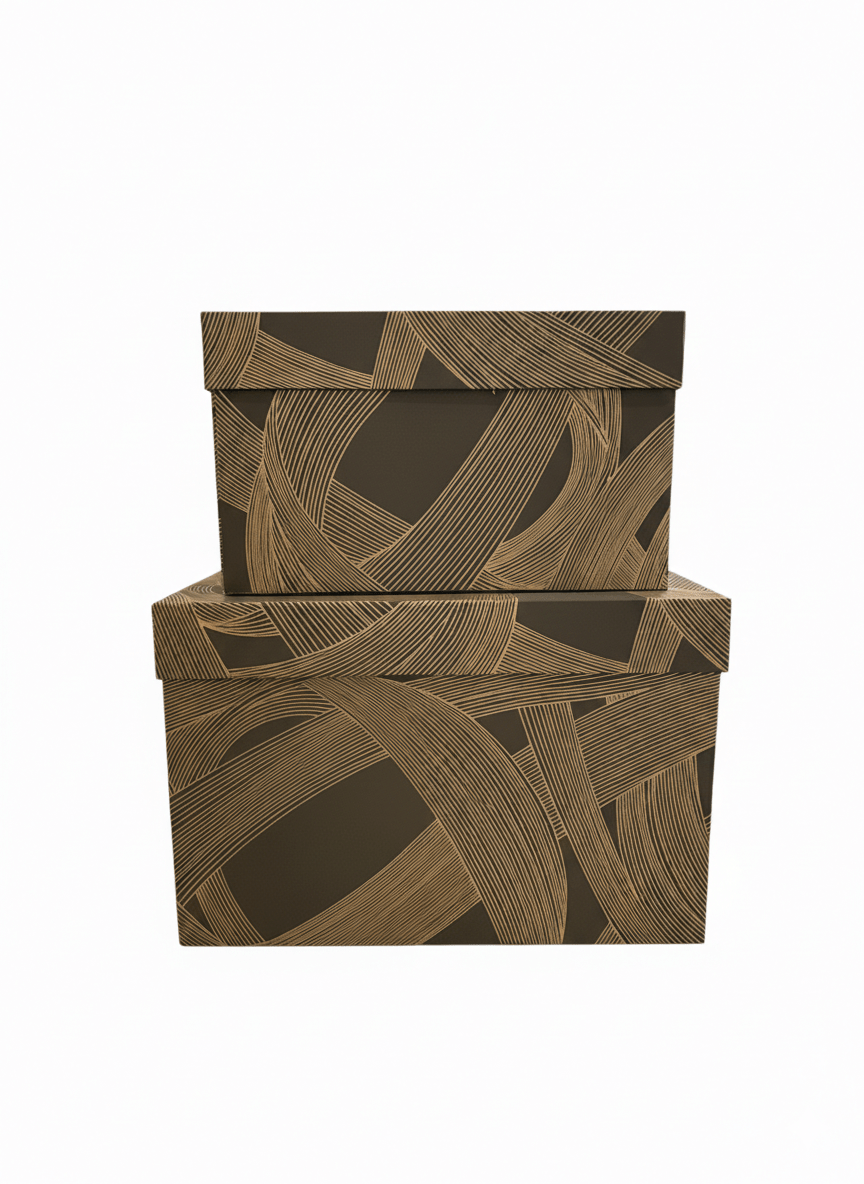 Elevate your storage with this sophisticated set of nesting gift boxes. Featuring a striking charcoal grey finish accented by an intricate, metallic gold ribbon-swirl pattern, these boxes blend modern art with practical organization.
