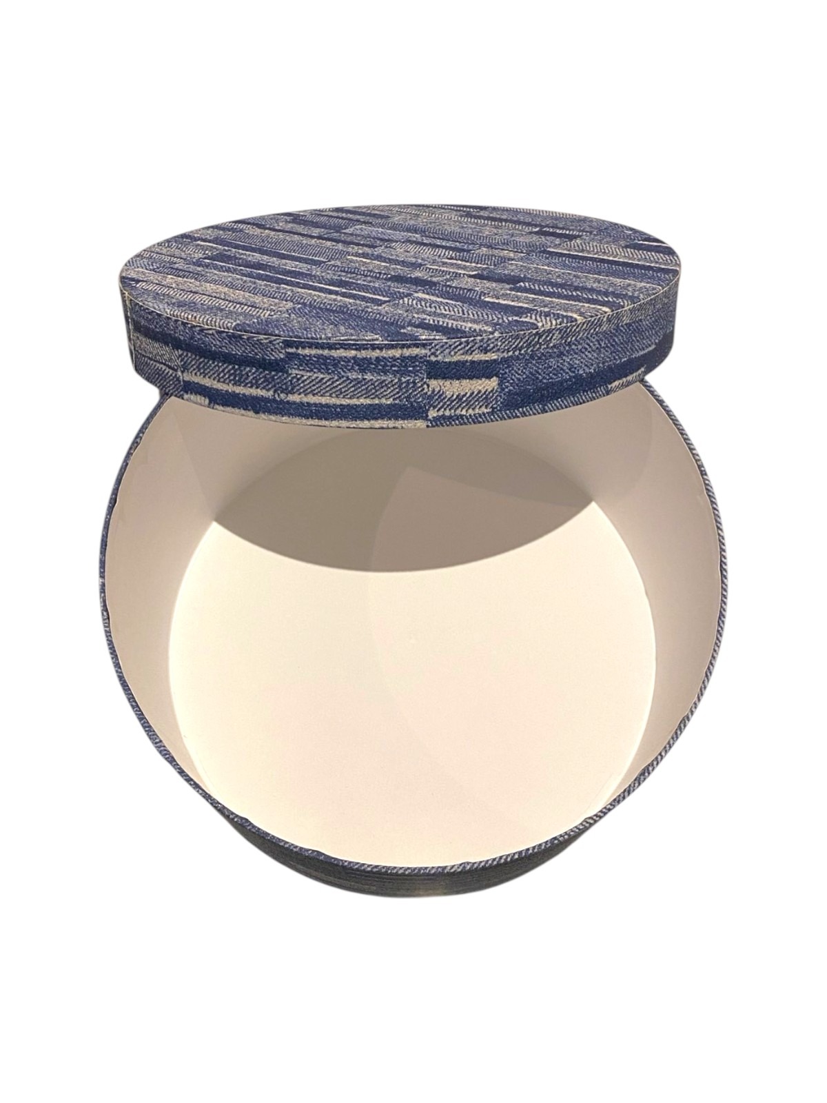 Elevate your space with this chic set of denim-inspired nesting boxes. Featuring a sophisticated indigo and cream geometric pattern, these cylindrical containers mimic the rich texture of woven textiles and ikat prints. Each piece is designed with a clean, bright white interior, making them perfect for organizing jewelry, stationery, or keepsakes while adding a modern touch to your decor. These versatile storage solutions stack beautifully to save space while keeping your essentials stylishly tucked away.