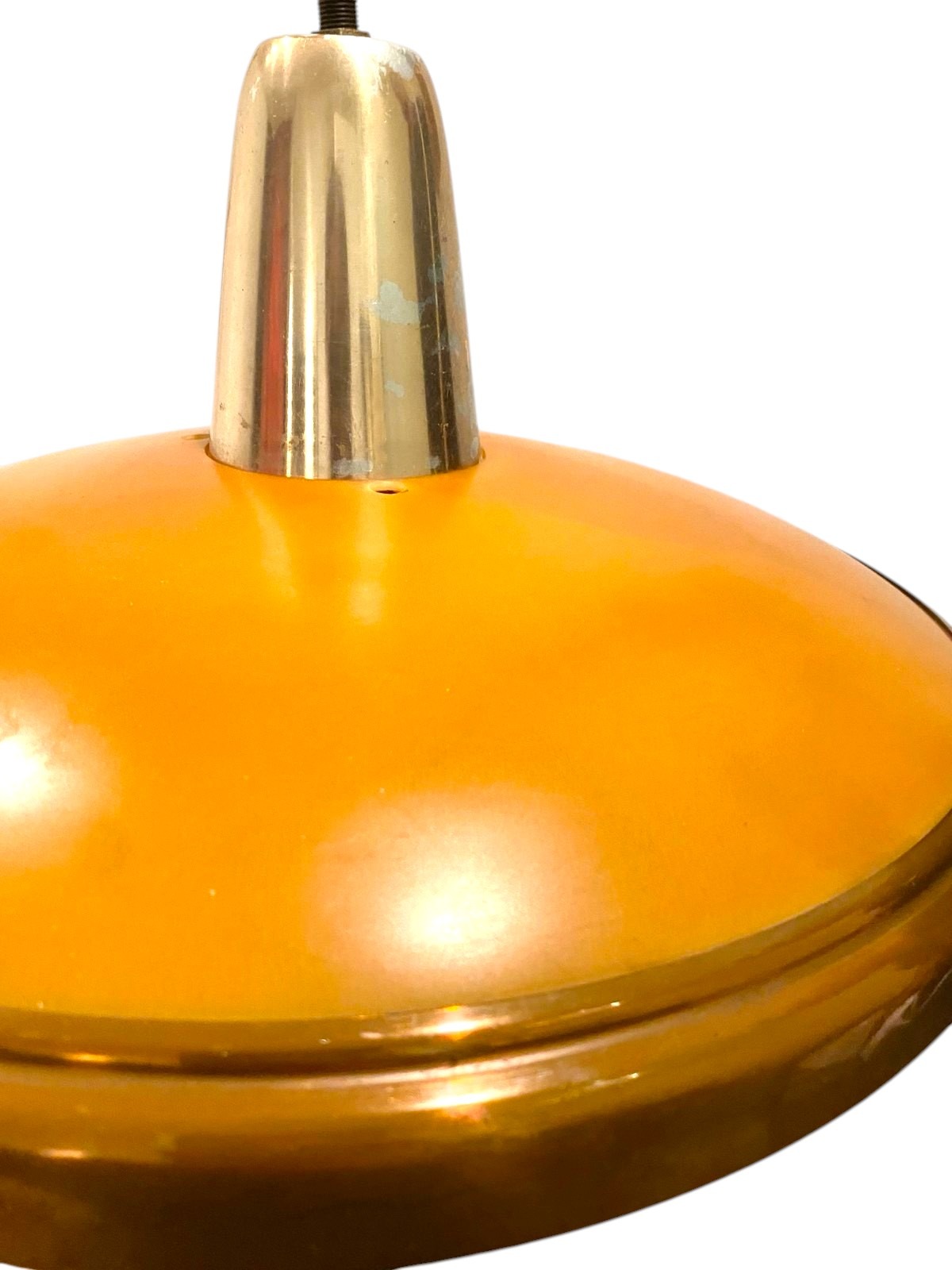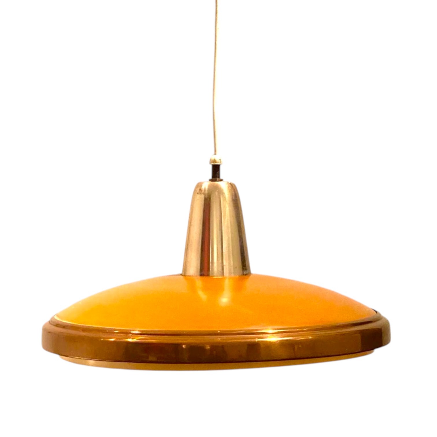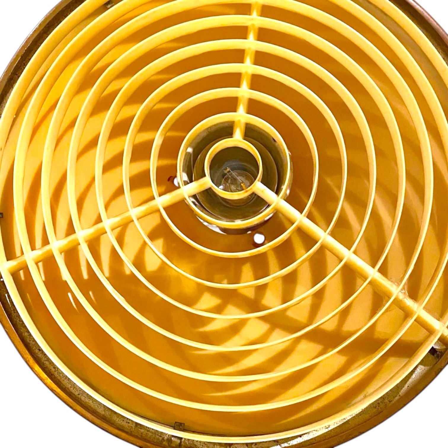 Striking 1970s Danish modern pendant lamp featuring a warm copper saucer shade and sculptural concentric louvered diffuser for soft, glare-free light. The layered cream interior creates a beautiful ambient glow while adding bold mid-century character. Perfect over a dining table or kitchen island, this statement piece blends Scandinavian craftsmanship with timeless modern design.