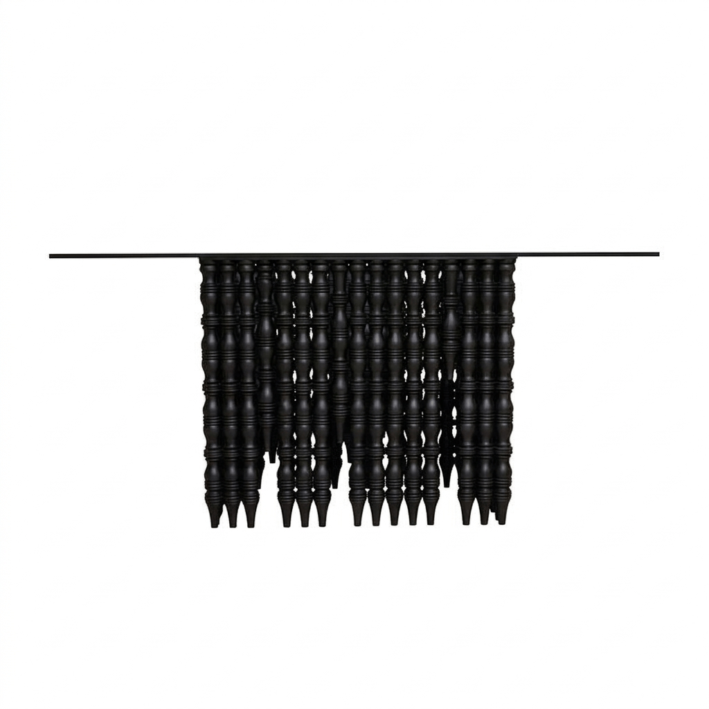 The Baluster collection draws inspiration from the balustrade, a ubiquitous structural and decorative element in colonial Hispanic architecture. As the central motif of every piece, wooden balusters are used primarily as a support structure, while their placements and variations create interesting, dynamic patterns. The Raides Dining Table, which seats 8-10 persons, is made of kiln-dried Gmelina wood and glass.