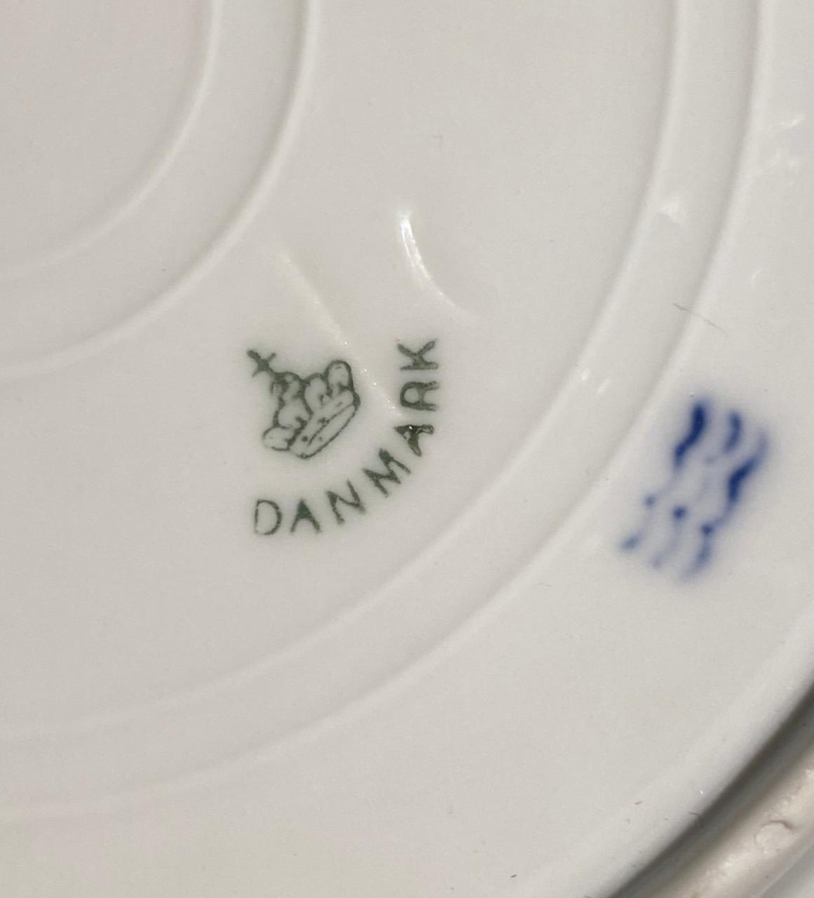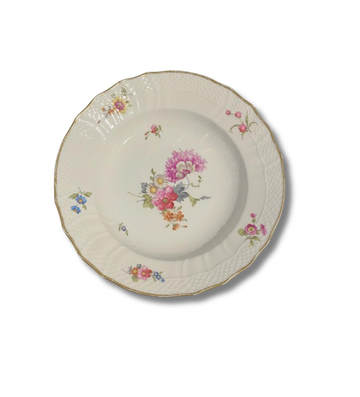 This hand-painted Danish porcelain piece features vibrant floral bouquets and delicate botanical sprays. It boasts a sophisticated basketweave (osier) embossed rim finished with 24k gold gilding. Each unique arrangement reflects the individual artistry of the painter. Includes authentic hallmarks: the green crown and iconic three blue waves. A timeless example of European elegance, perfect for collectors.