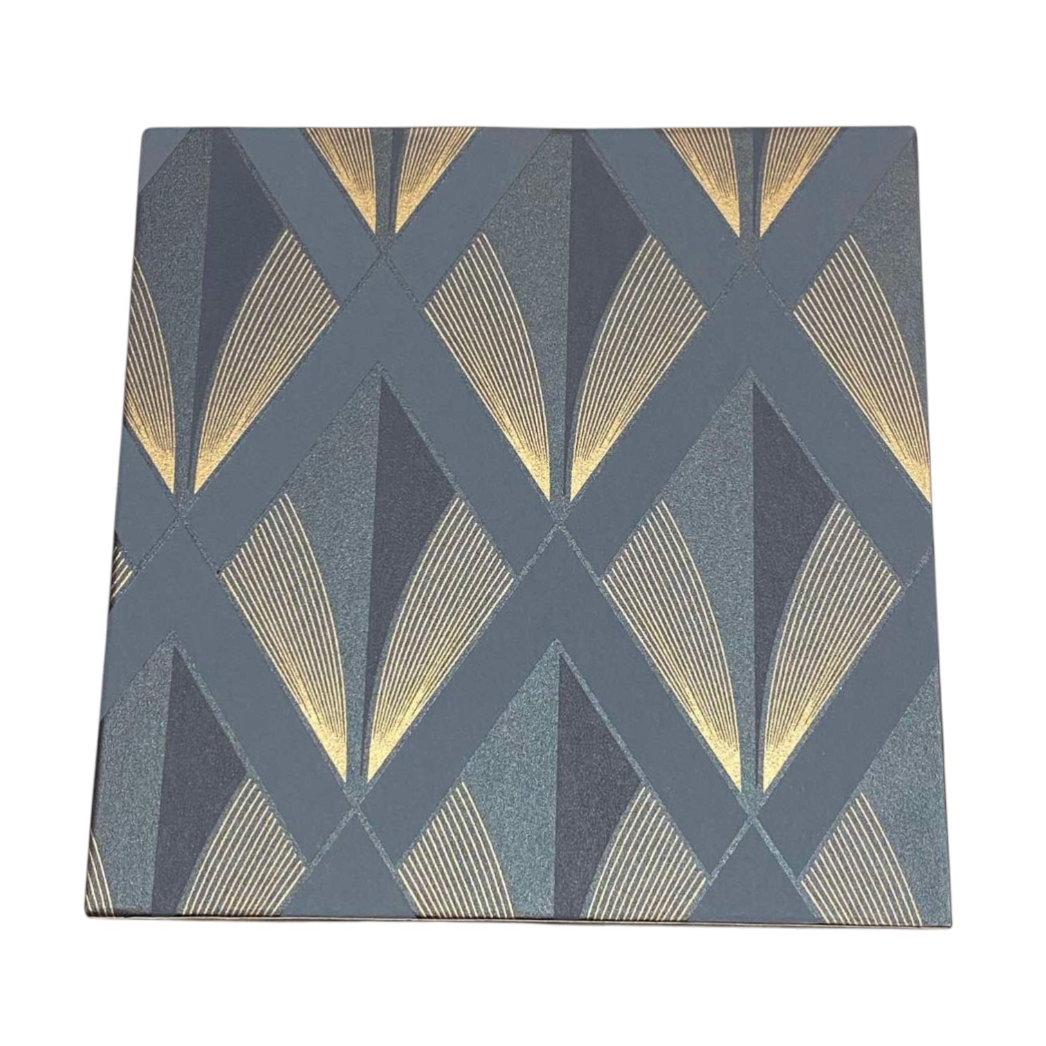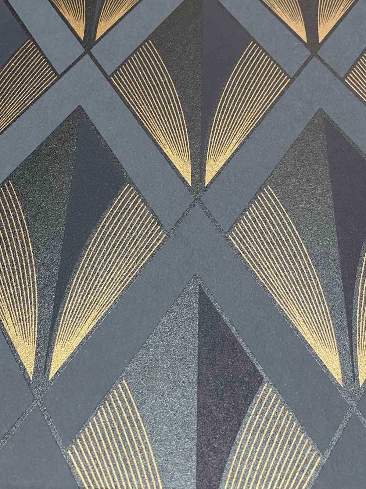 Organize your space with a touch of timeless Art Deco flair using this set of rectangular nesting storage boxes. Each piece showcases a striking geometric pattern featuring bold navy and slate triangles accented by shimmering gold fan motifs. The structured design and matching lids make them perfect for tidying away office supplies, craft materials, or personal mementos while acting as a stylish focal point. Durable and elegant, these boxes bring a cohesive, upscale look to any shelf or desk.