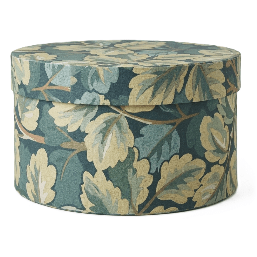 Discover the perfect blend of utility and artistry with these round nesting boxes, adorned in a rich, illustrative leaf pattern. The deep forest green backdrop beautifully contrasts with the sage and cream foliage, offering a sophisticated botanical look that complements any interior.