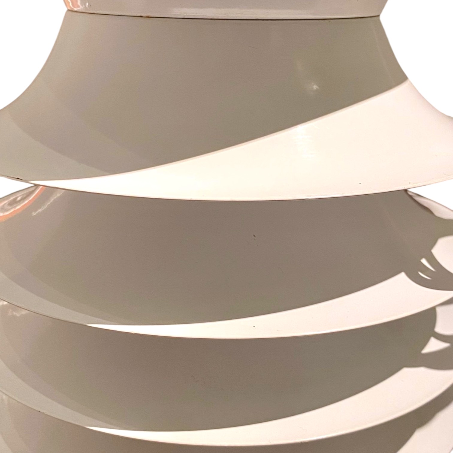 Elevate your home with this vintage Danish lamp, white, multi-layered single light. 1970s, in the style of Jørgen Gammelgaard, ‘Tip Top lamp. Its white lacquer multi-tiered shades provide soft, glare-free lighting. This durable metal fixture captures timeless elegance, making it a perfect centerpiece for dining areas or cozy reading nooks.