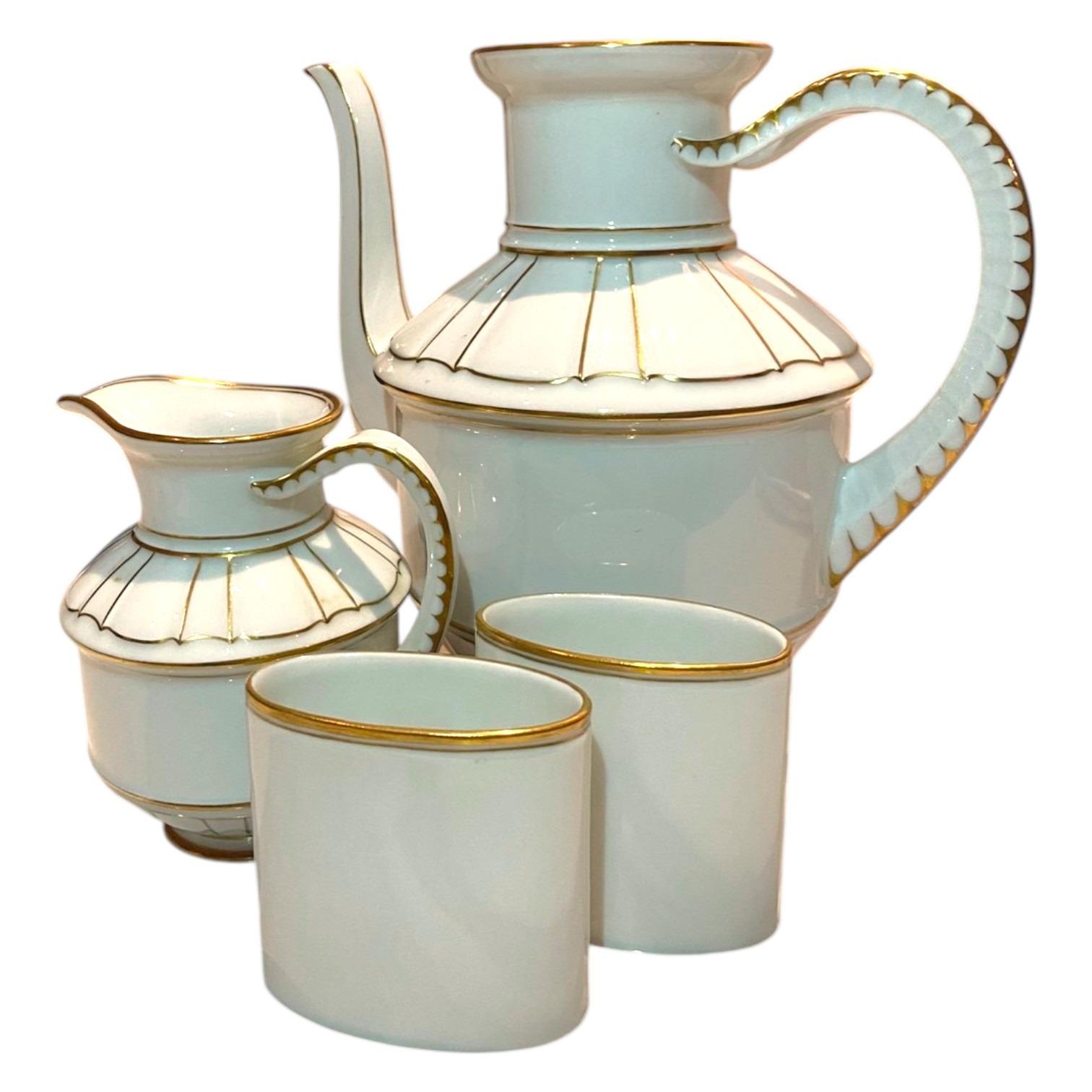 Elevate your collection with this elegant Bing & Grøndahl porcelain set. Founded in Copenhagen in 1853, this factory is renowned for its high standard of quality and fine craftsmanship. These pieces feature classic gold-banded designs, reflecting the unique artistry that led to the 1987 merger with Royal Copenhagen. Sought after by collectors worldwide, this set brings timeless Danish heritage and sophisticated beauty to any table.