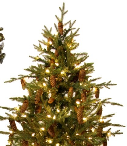 A beautiful Fir tree with around 250 cones with lights and ready for ornamentation. This is from our past Christmas collection.
