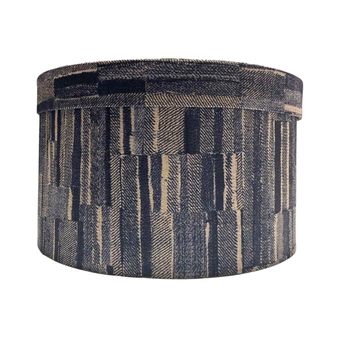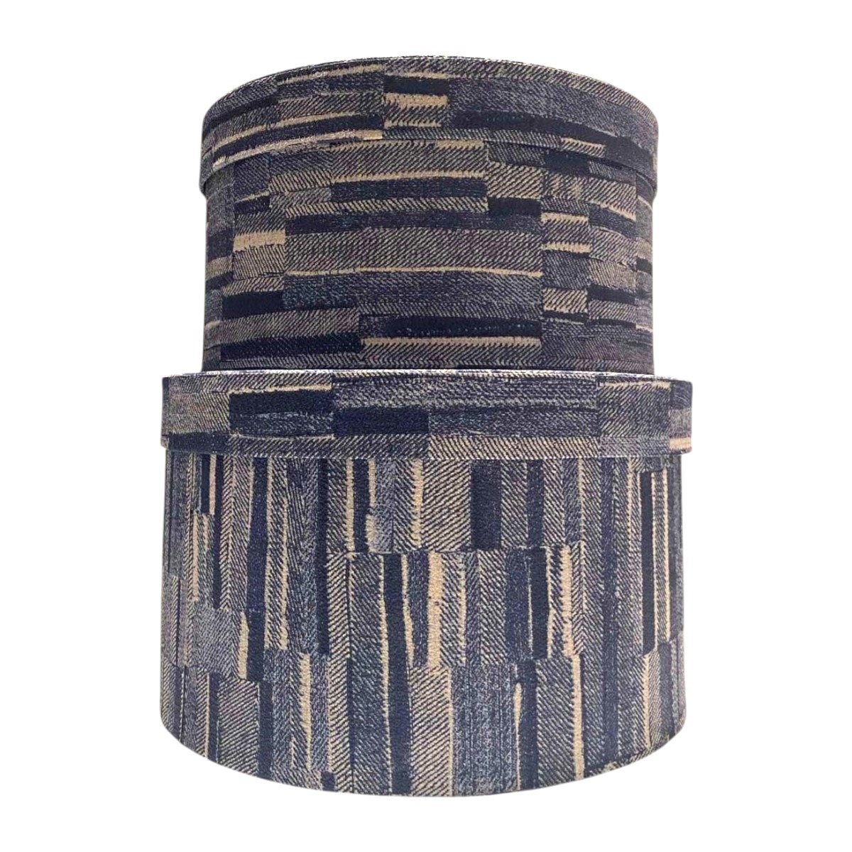 Elevate your space with this chic set of denim-inspired nesting boxes. Featuring a sophisticated indigo and cream geometric pattern, these cylindrical containers mimic the rich texture of woven textiles and ikat prints. Each piece is designed with a clean, bright white interior, making them perfect for organizing jewelry, stationery, or keepsakes while adding a modern touch to your decor. These versatile storage solutions stack beautifully to save space while keeping your essentials stylishly tucked away.