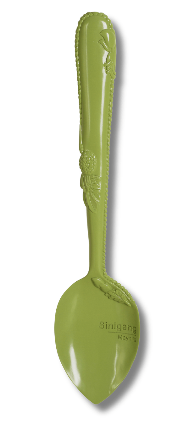 A familiar form, reimagined with quiet intention. This oversized spoon and fork draw from a Filipino household icon, translated into a sculptural wall object that speaks of everyday meals and shared tables. Finished in soft green and detailed with subtle floral relief, the pair carries both nostalgia and restraint — playful in scale, yet calm in presence. The mark “Sinigang Maynila” is a quiet nod to the dish that anchors many Manila kitchens, a flavor that feels like home and routine, rather than occasion.