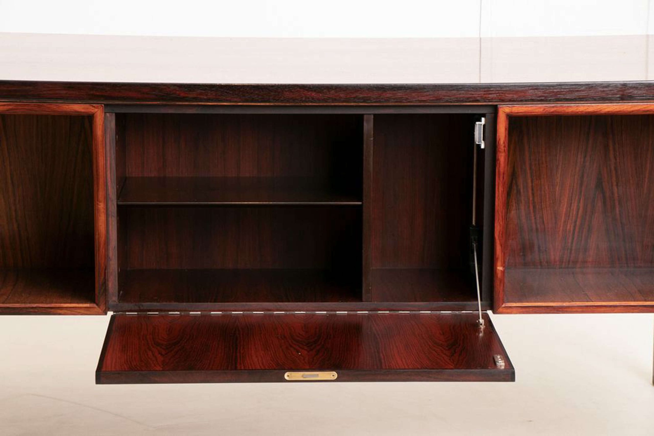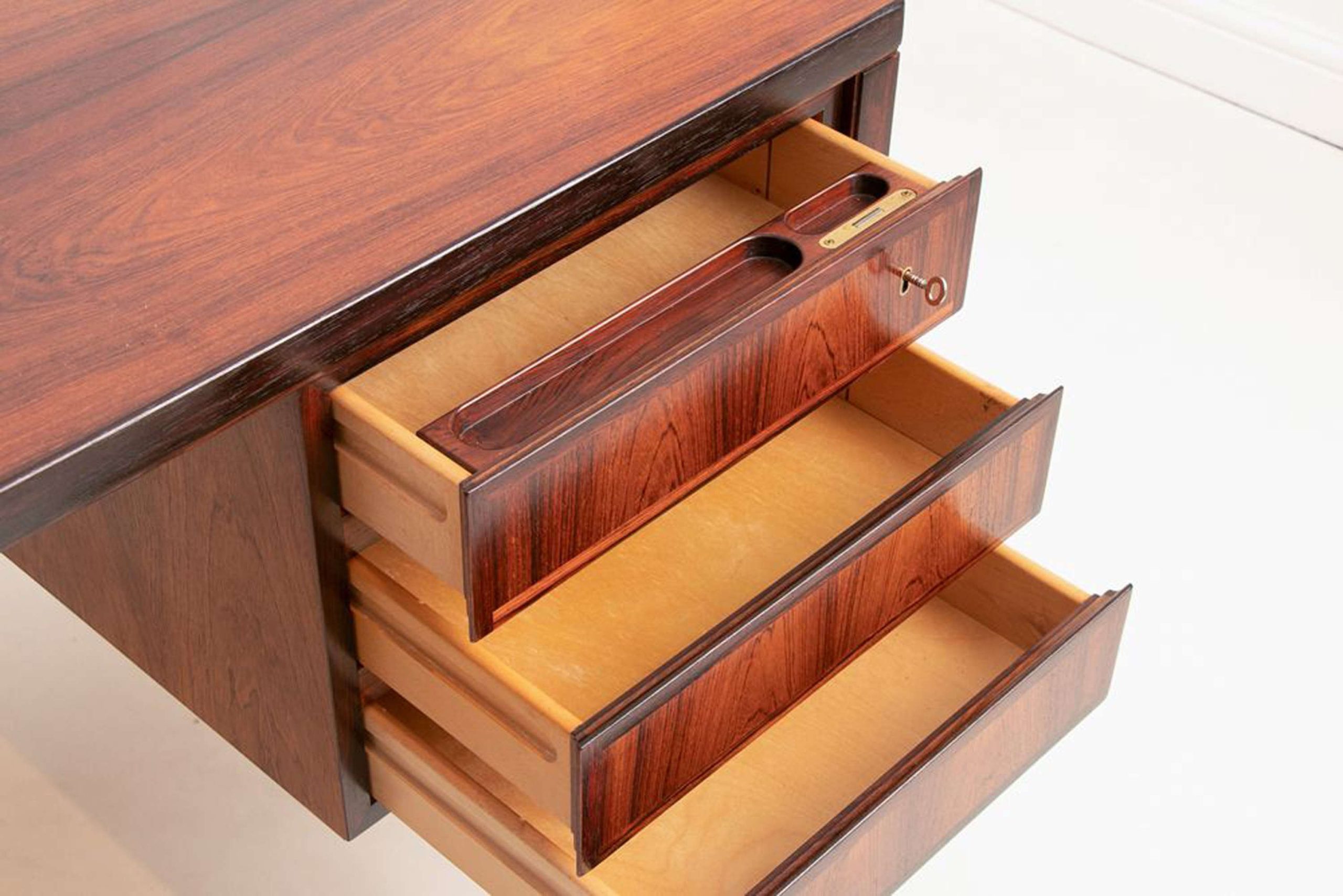 A Danish midcentury rosewood desk designed by Omann Jun with six drawers and drop door back.