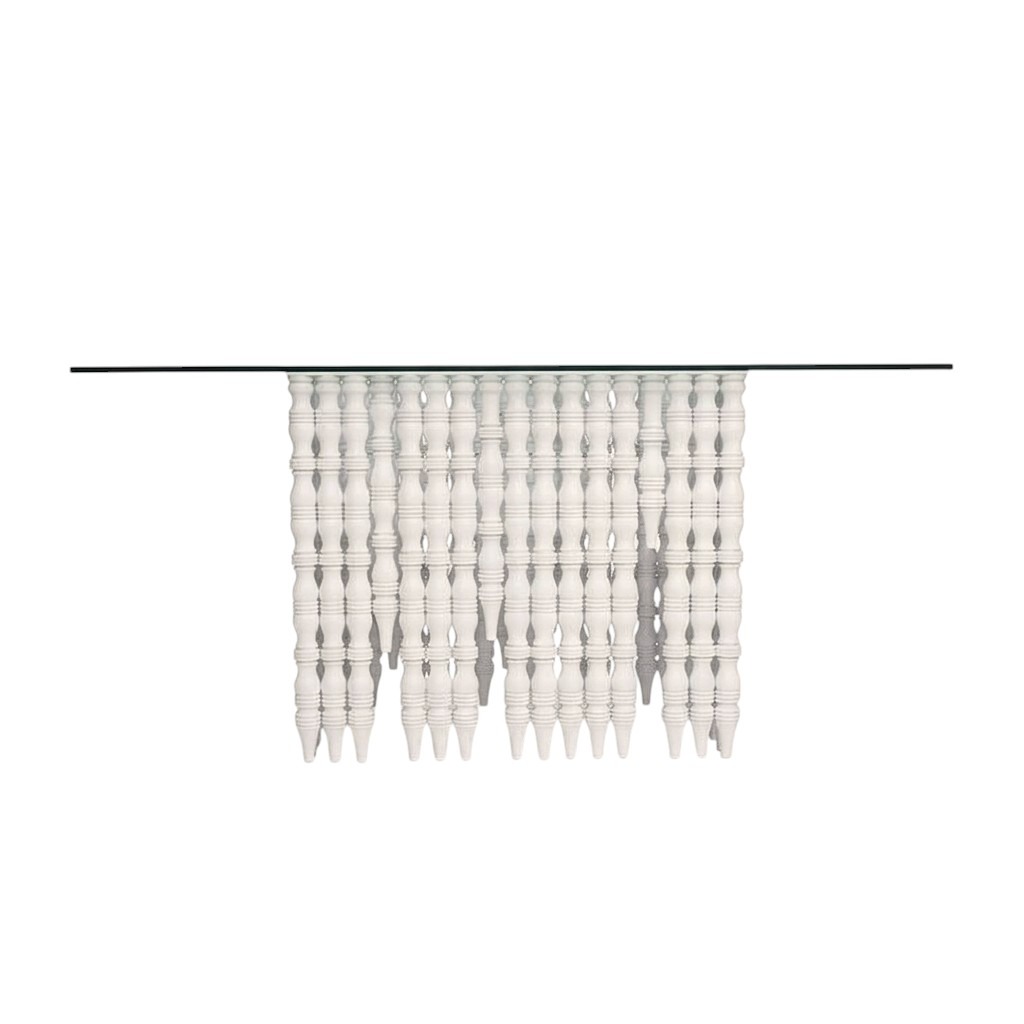 The Baluster collection draws inspiration from the balustrade, a ubiquitous structural and decorative element in colonial Hispanic architecture. As the central motif of every piece, wooden balusters are used primarily as a support structure, while their placements and variations create interesting, dynamic patterns. The Raides Dining Table, which seats 8-10 persons, is made of kiln-dried Gmelina wood and glass.