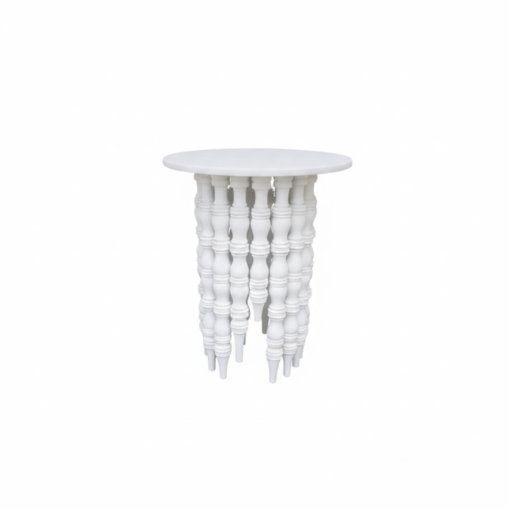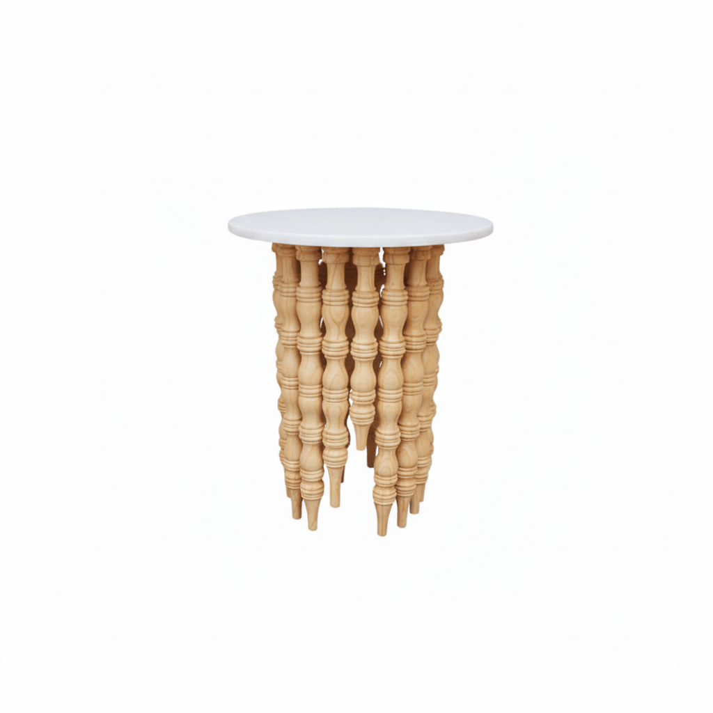 The Baluster collection draws inspiration from the balustrade, a ubiquitous structural and decorative element in colonial Hispanic architecture. As the central motif of every piece, wooden balusters are used primarily as a support structure, while their placements and variations create interesting, dynamic patterns. The Raides Side Table is made of kiln-dried Gmelina wood and marble.