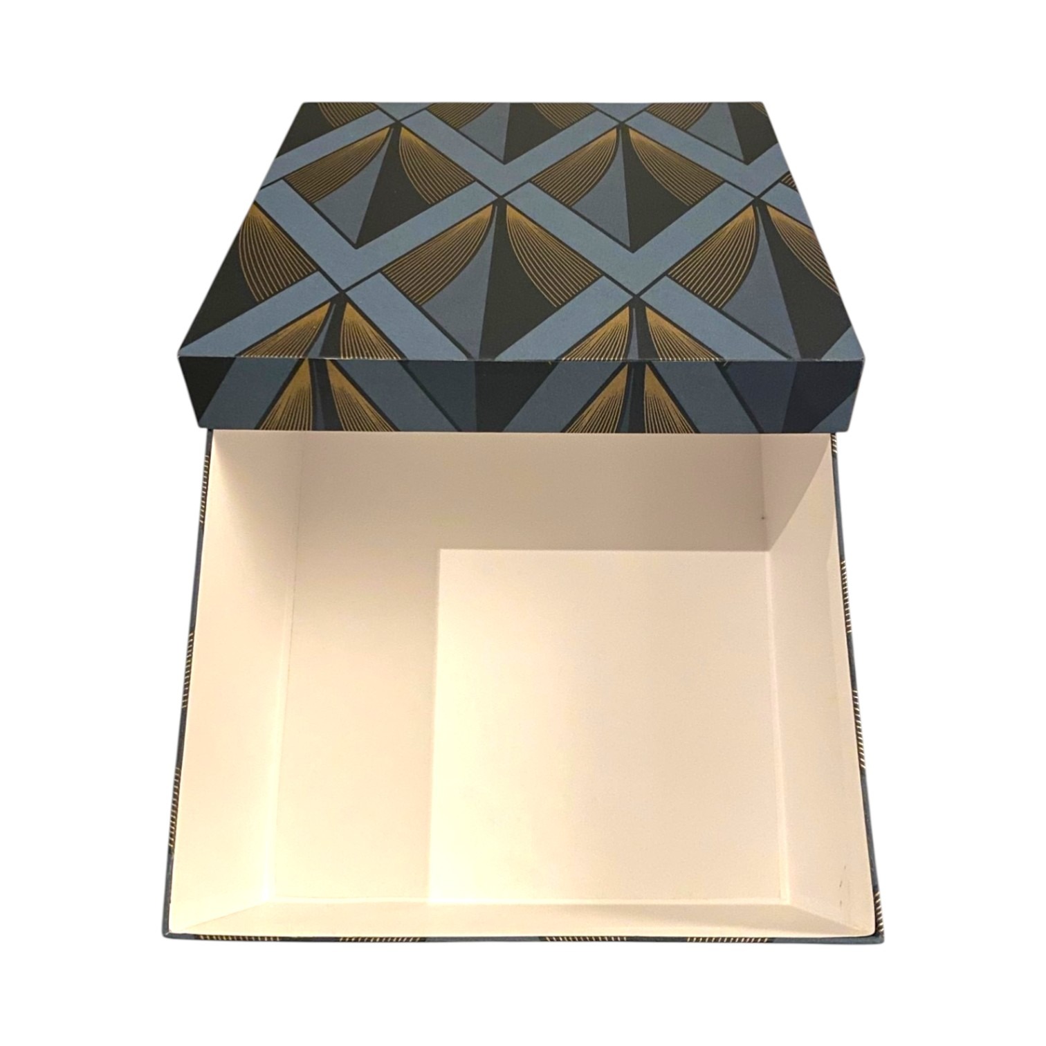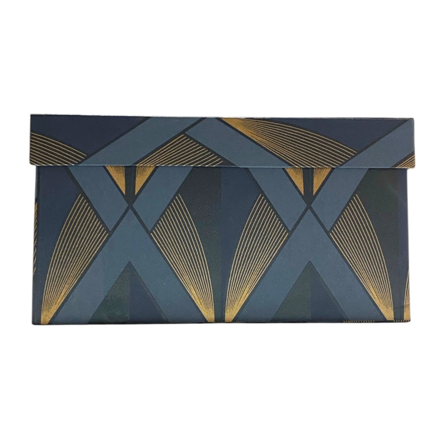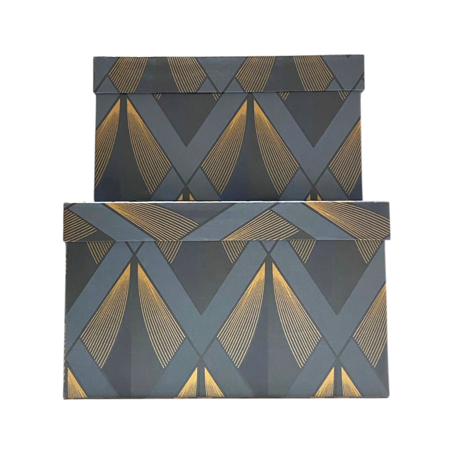 Organize your space with a touch of timeless Art Deco flair using this set of rectangular nesting storage boxes. Each piece showcases a striking geometric pattern featuring bold navy and slate triangles accented by shimmering gold fan motifs. The structured design and matching lids make them perfect for tidying away office supplies, craft materials, or personal mementos while acting as a stylish focal point. Durable and elegant, these boxes bring a cohesive, upscale look to any shelf or desk.
