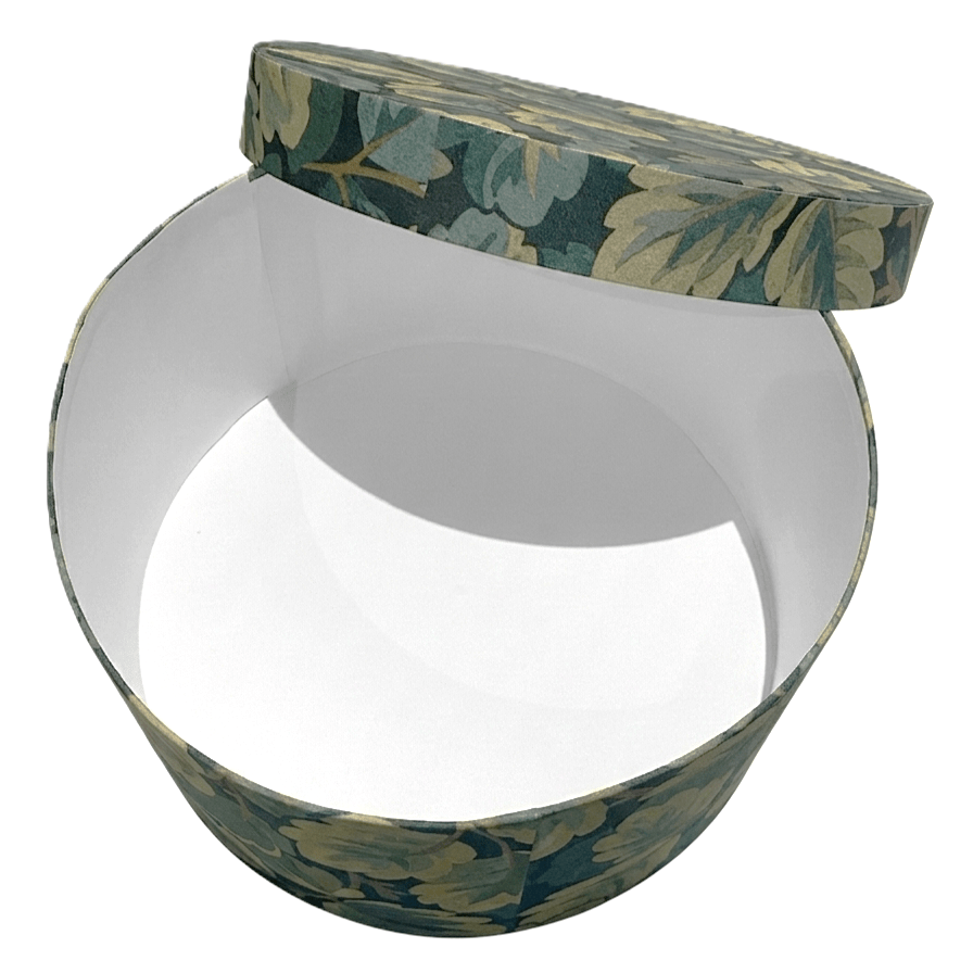 Discover the perfect blend of utility and artistry with these round nesting boxes, adorned in a rich, illustrative leaf pattern. The deep forest green backdrop beautifully contrasts with the sage and cream foliage, offering a sophisticated botanical look that complements any interior.