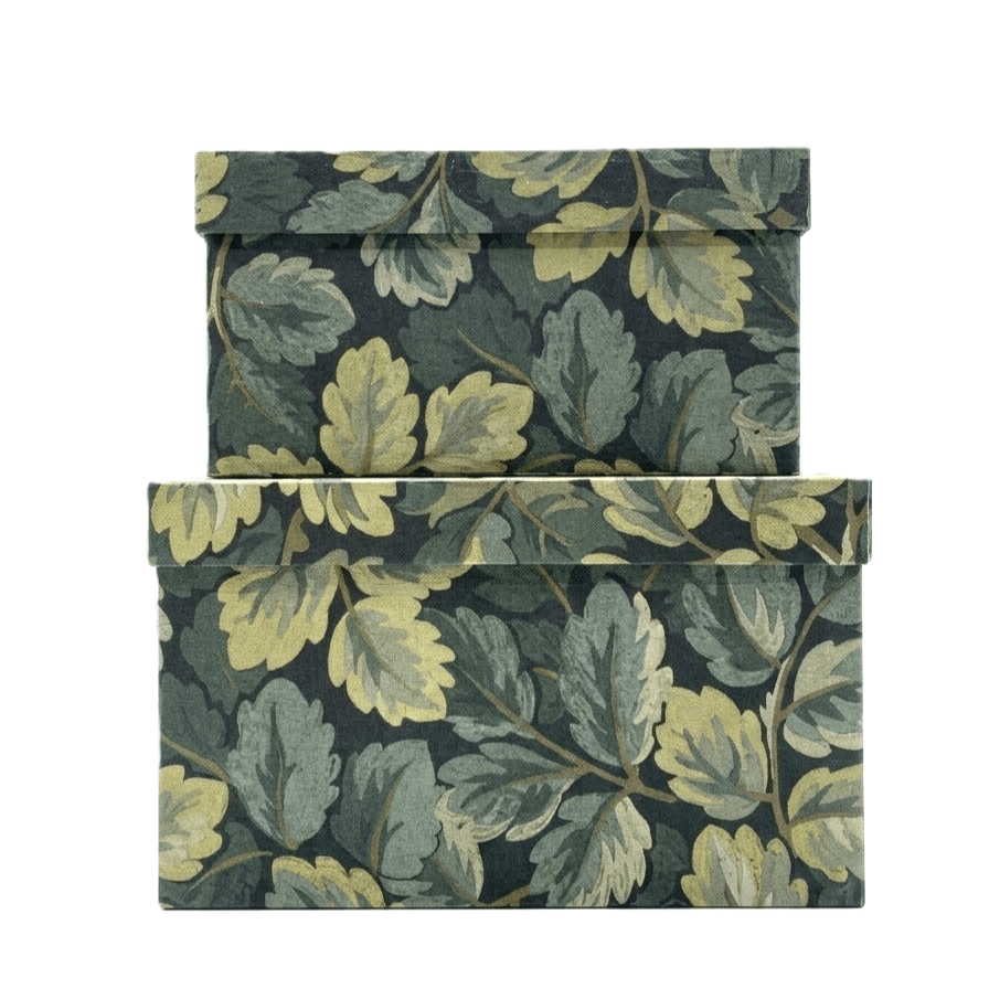 Elevate your organization with this set of nesting decorative boxes, featuring a timeless botanical oak leaf motif in muted sage, forest green, and gold. Perfect for tidying desktops or storing mementos, these sturdy, high-quality boxes blend effortlessly into traditional or modern interiors. The clean white interior offers a crisp contrast to the earthy exterior. Use them stacked to add height to your decor or separately for stylish utility.