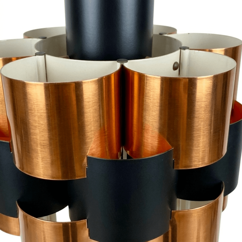 Bring timeless Danish elegance to your space with this vintage mid-century pendant lamp by Werner Schou for Coronell Electro. Crafted in Scandinavia, this striking fixture features a bold mix of brushed copper and black lacquered metal. Its sculptural design creates a warm, atmospheric glow, making it a perfect statement piece for modern interiors.